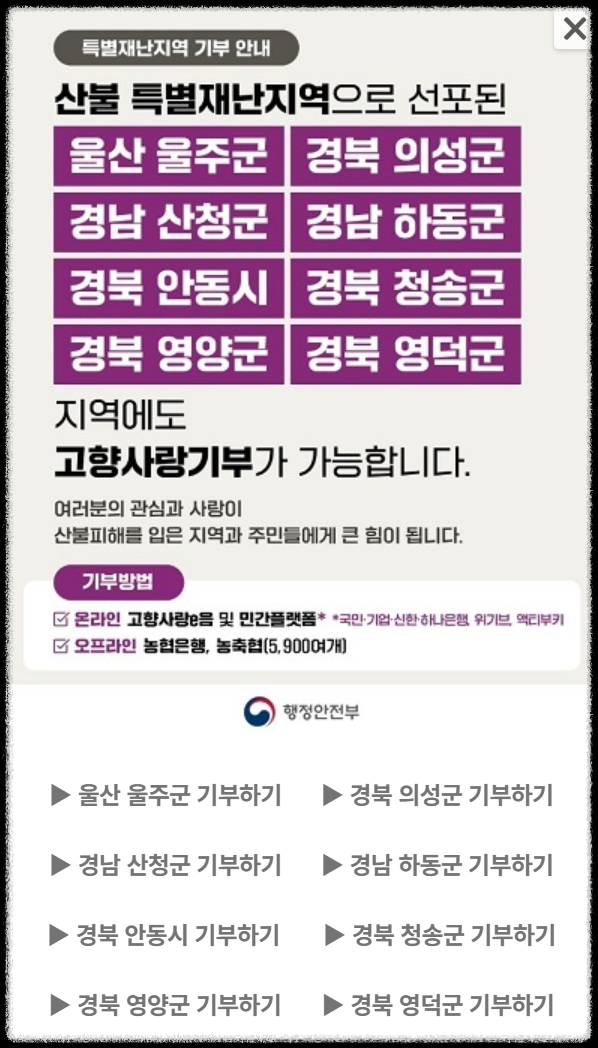 2025년 대형 산불피해가 있는 만큼 고향사랑e음에서 쉽게 기부할 수 있으니, 산불 피해지역을 찾아 기부해 보는 것도 뜻깊은 선행입니다! 😊💙
