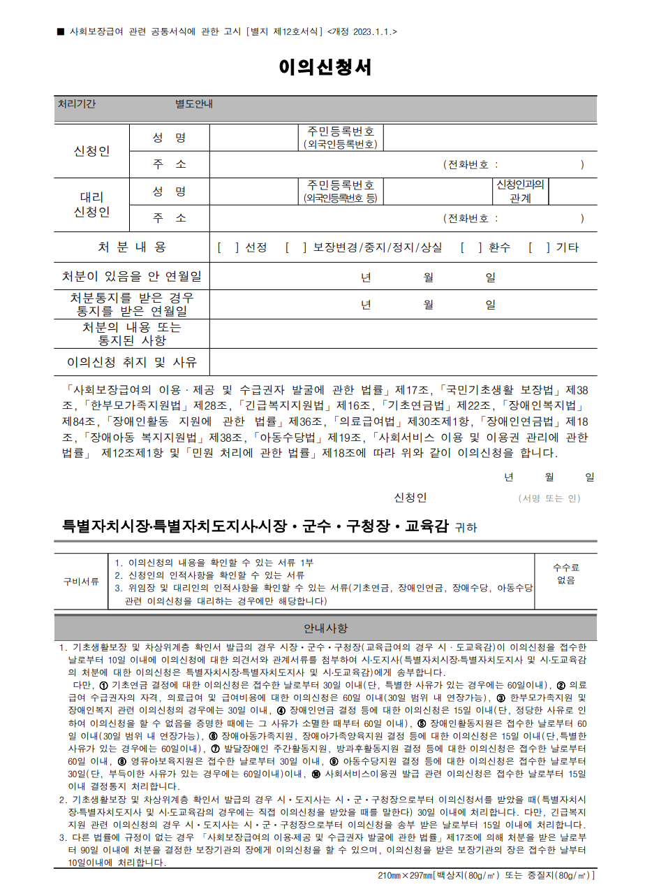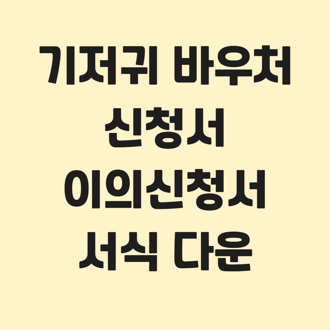- 기저귀 바우처 등 사회보장급여 자격 중지 안내를 받으신 분 중에서 이의가 있으신 분은 아래 이의 신청서 내용 작성 후 관할 주민센터에 제출하시면 됩니다.