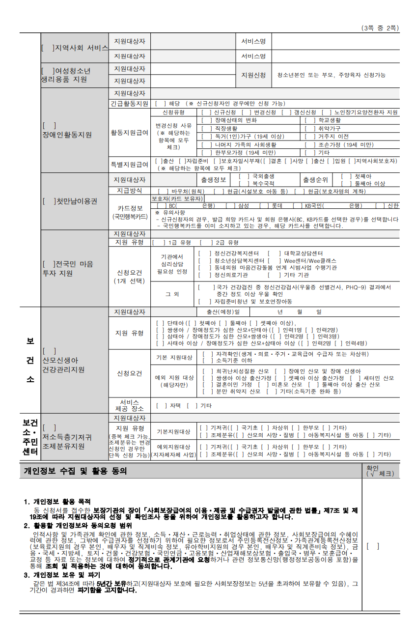 - 기저귀 바우처 외 보육료, 양육수당, 첫만남이용권, 여성청소년 생리대 지원 등 다양한 사회보장급여를 신청할 수 있는 신청서입니다.