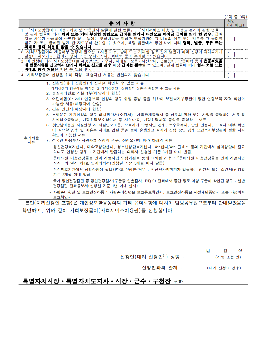 - 온라인으로 신청이 어려우시면 해당 신청서 작성 후 관할 주민센터에 제출하시면 됩니다.
