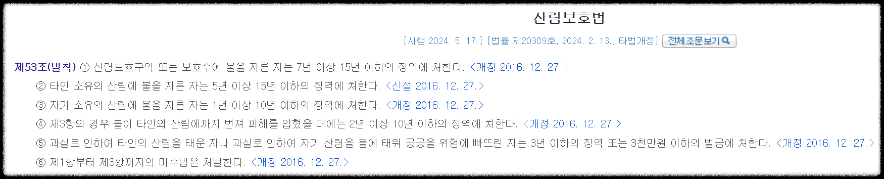 - 산림보호법 53조 2항 : 타인 소유의 산림에 불을 지른 자는 5년 이상 15년 이하의 징역에 처한다.
