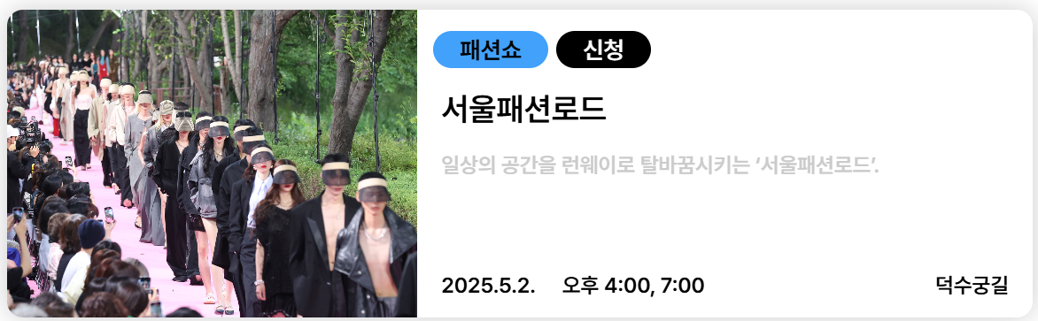 | 패션쇼 | 서울패션로드(신청) | 25.05.02(금) | 오후 4:00 / 7:00 |