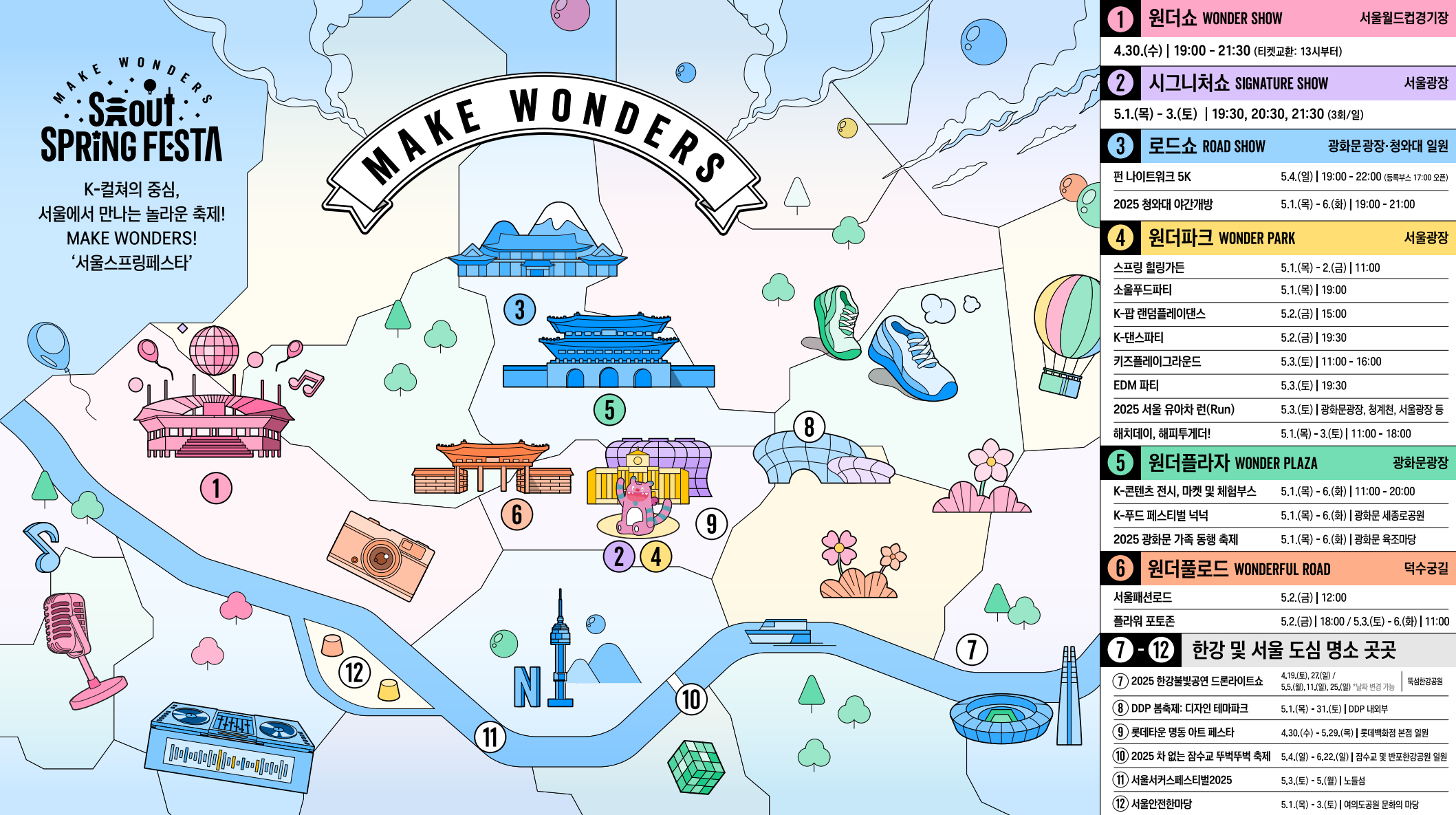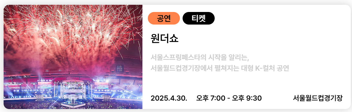 | 공연 | 원더쇼(티켓예매 필요) | 25.04.30(수) | 오후 7:00 ~ 오후 9:30 |