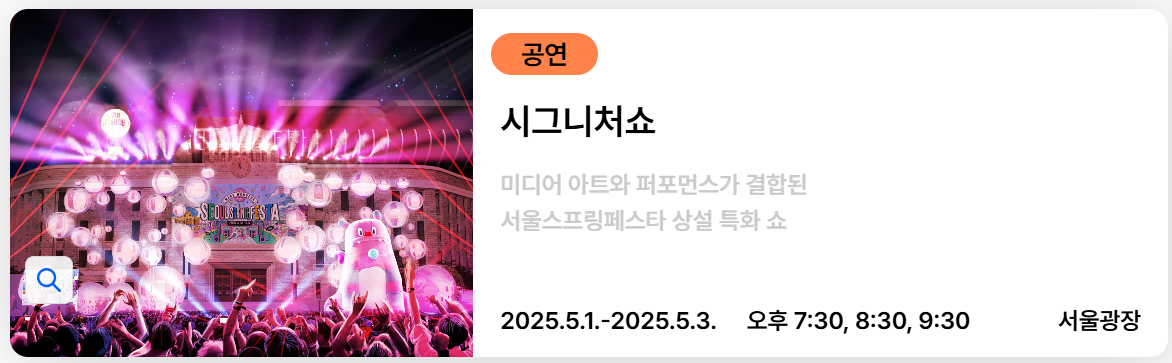 | 공연 | 시그니처쇼 | 25.05.01(목) ~ 25.05.03(토) | 오후 7:30 / 8:30 / 9:30 |