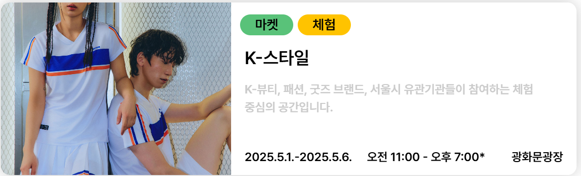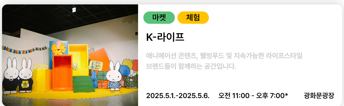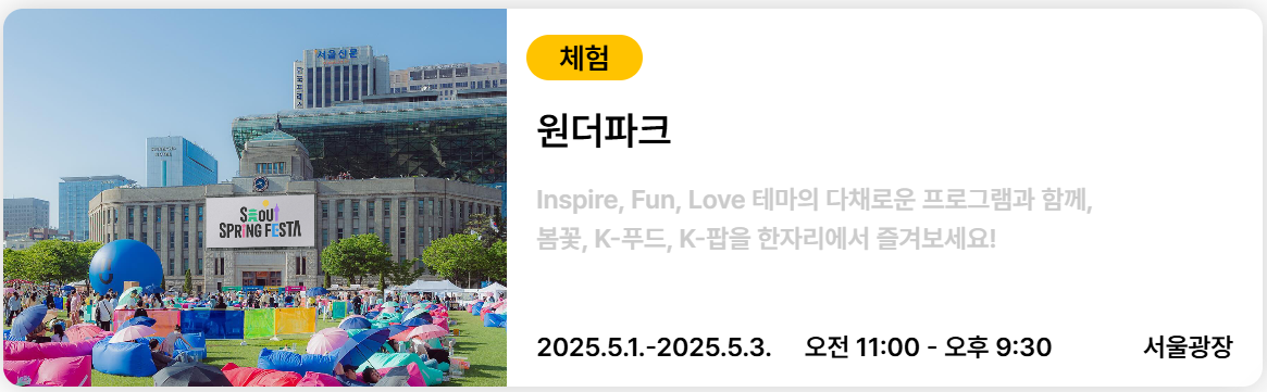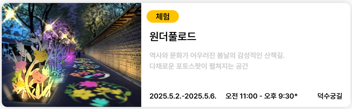 | 체험 | 원더풀로드 | 25.05.02(금) ~ 25.05.06(화) | 오전 11:00 ~ 오후 9:30 |