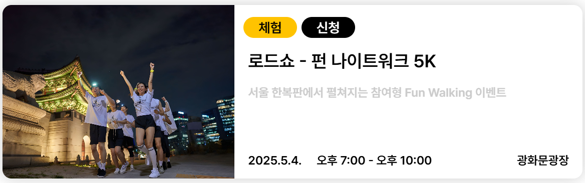 | 체험 | 로드쇼 - 펀 나이트워크 5K | 25.05.04(일) | 오후 7:00 ~ 오후 10:00 |