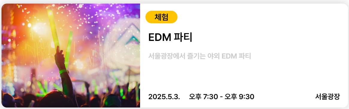 | EDM 파티 | 25.05.03(토) | 오후 7:30 ~ 오후 9:30 |