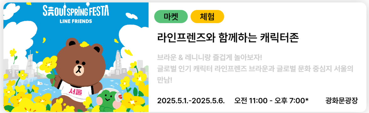 | 라인프렌즈 캐릭터존 | 25.05.01(목) ~ 25.05.06(화) | 오전 11:00 ~ 오후 7:00 |