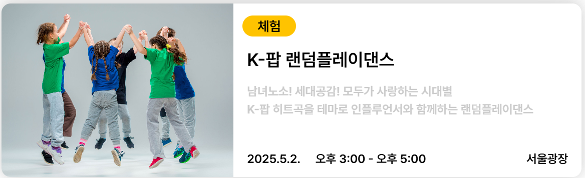 | K팝 랜덤 플레이댄스 | 25.05.02(금) | 오후 3:00 ~ 오후 5:00 | |