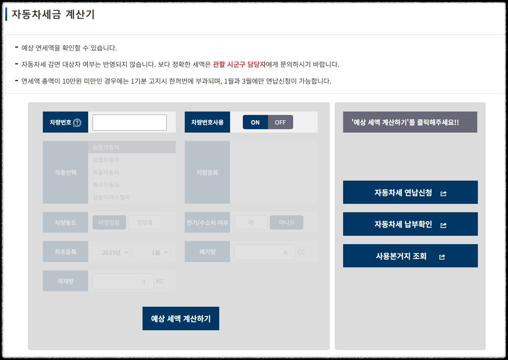 - 자동차365 사이트 자동차세금 계산기로 예상 연납부액을 확인하 실 수 있습니다.