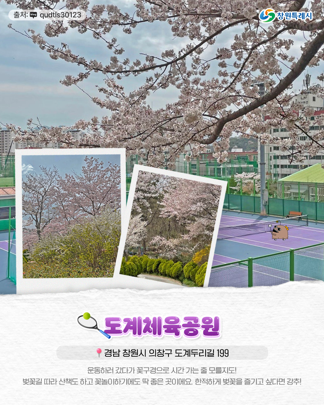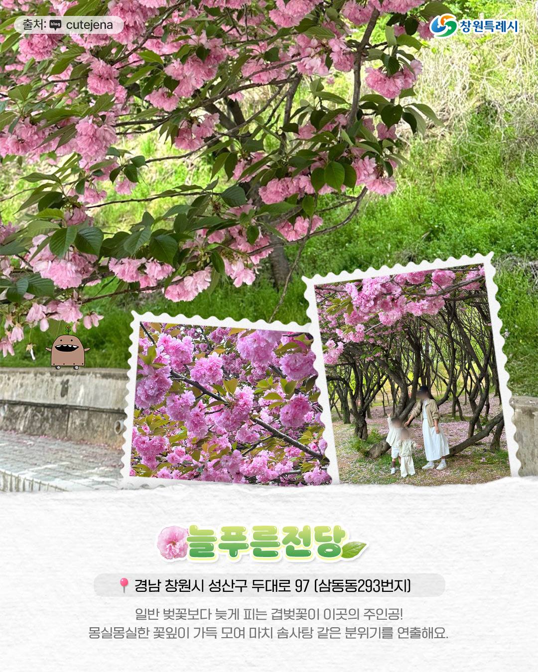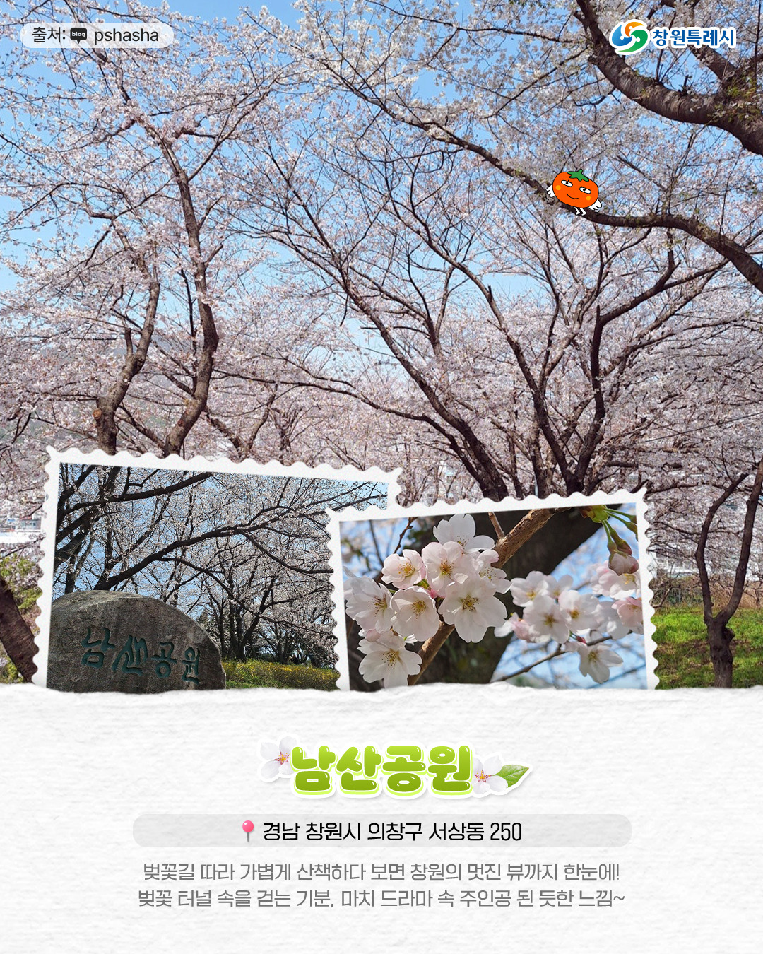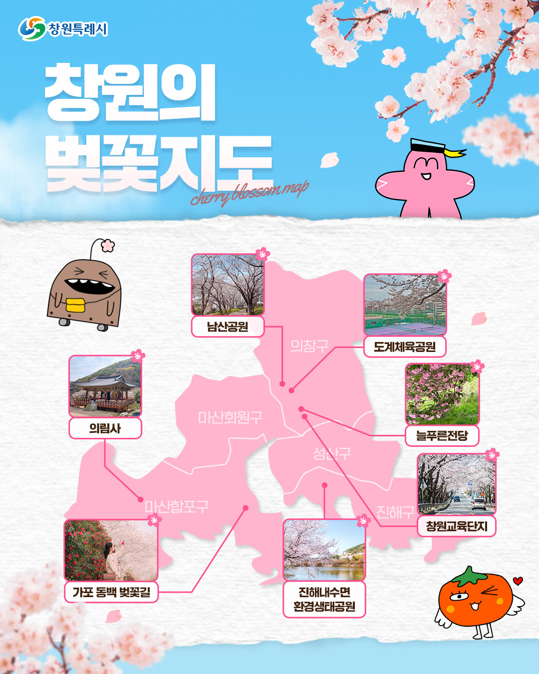 - 남산공원, 도계체육공원, 늘푸른전당, 창원교육단지, 진해내수면환경생태공원, 가포 동백 벚꽃길이 있습니다.