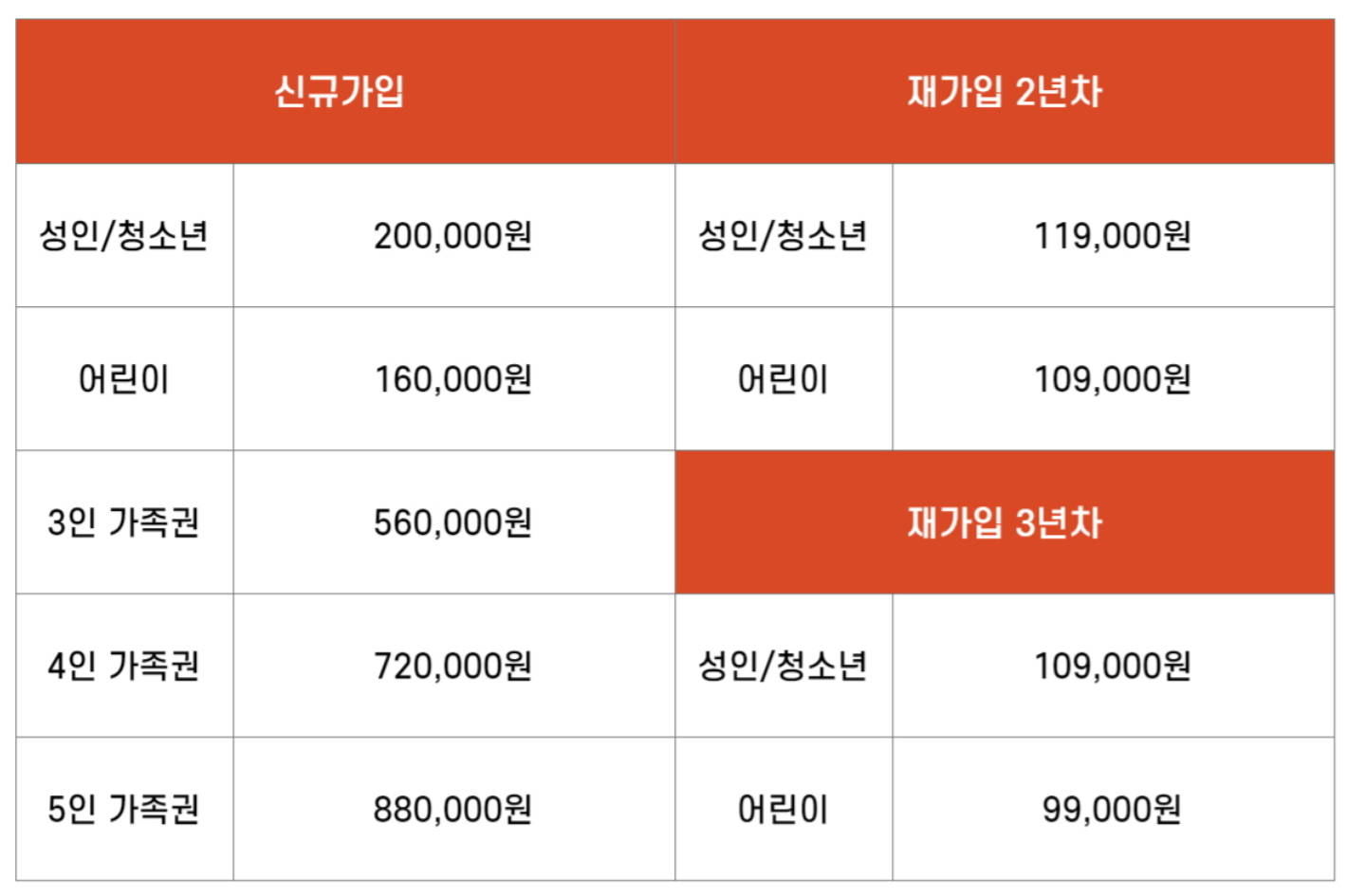 성인/청소년은 신규 200,000만원에서 재가입 2년차에는 약 40% 할인된 금액(119,000원)으로, 재가입 3년차에는 약 55% 할인(109,000원)된 금액으로 가입 가능