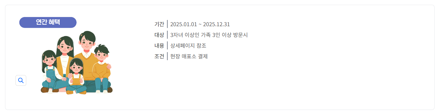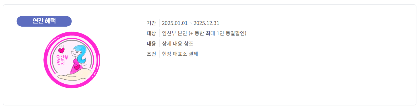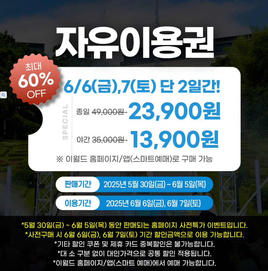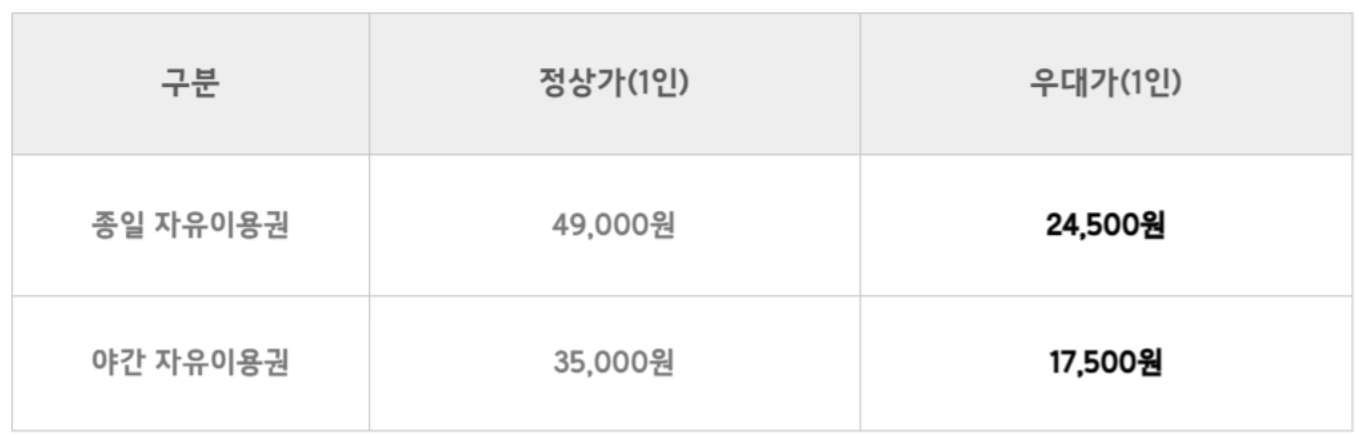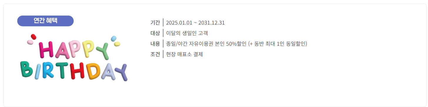 - 자유이용권 구입시 적용 가능한 혜택이며, 종일&야간 자유이용권 적용가능합니다.