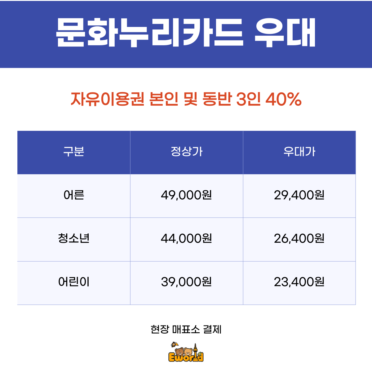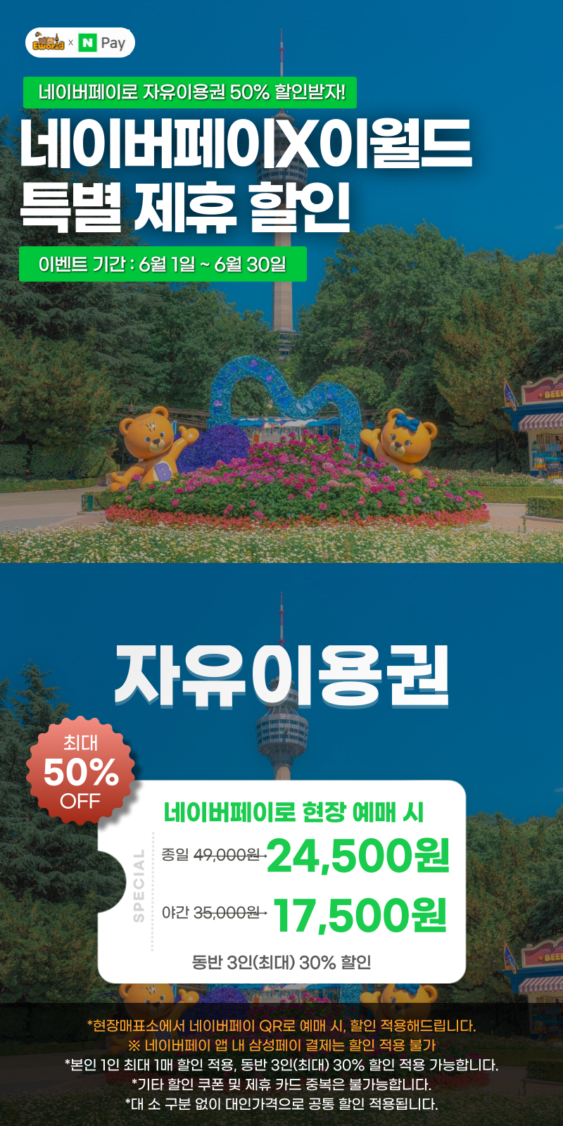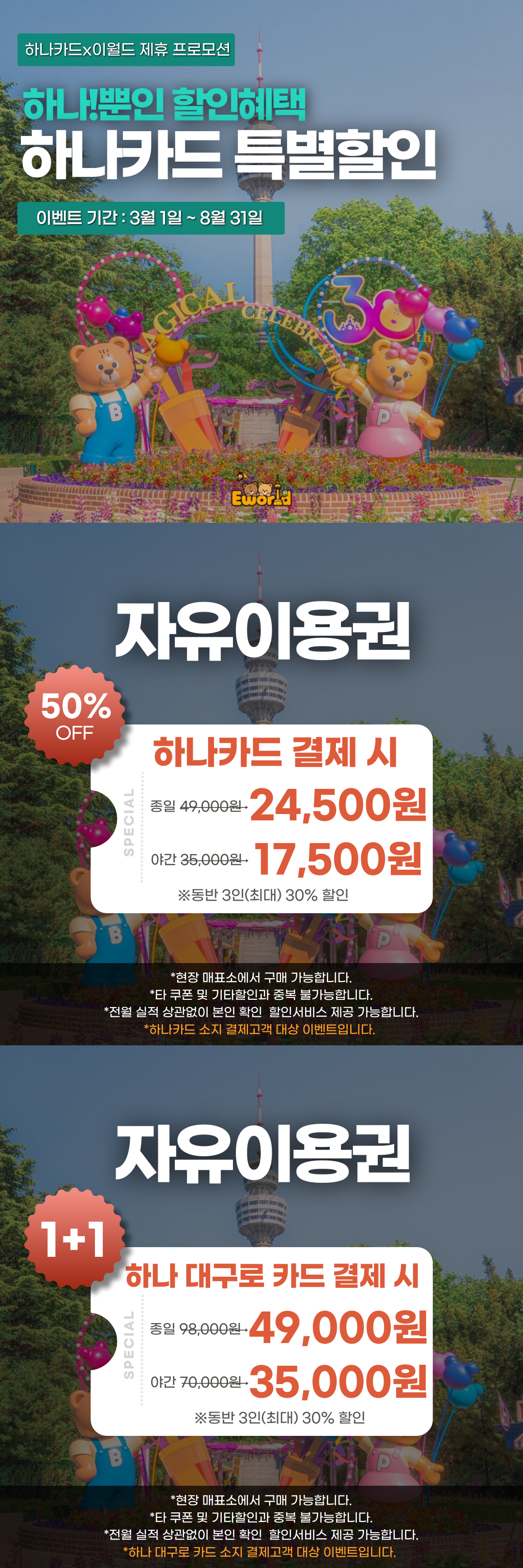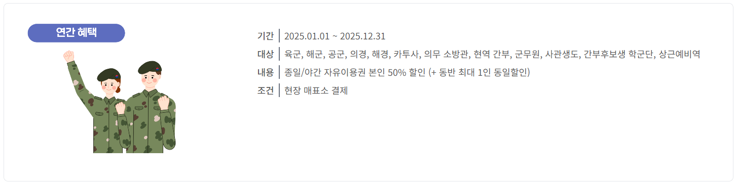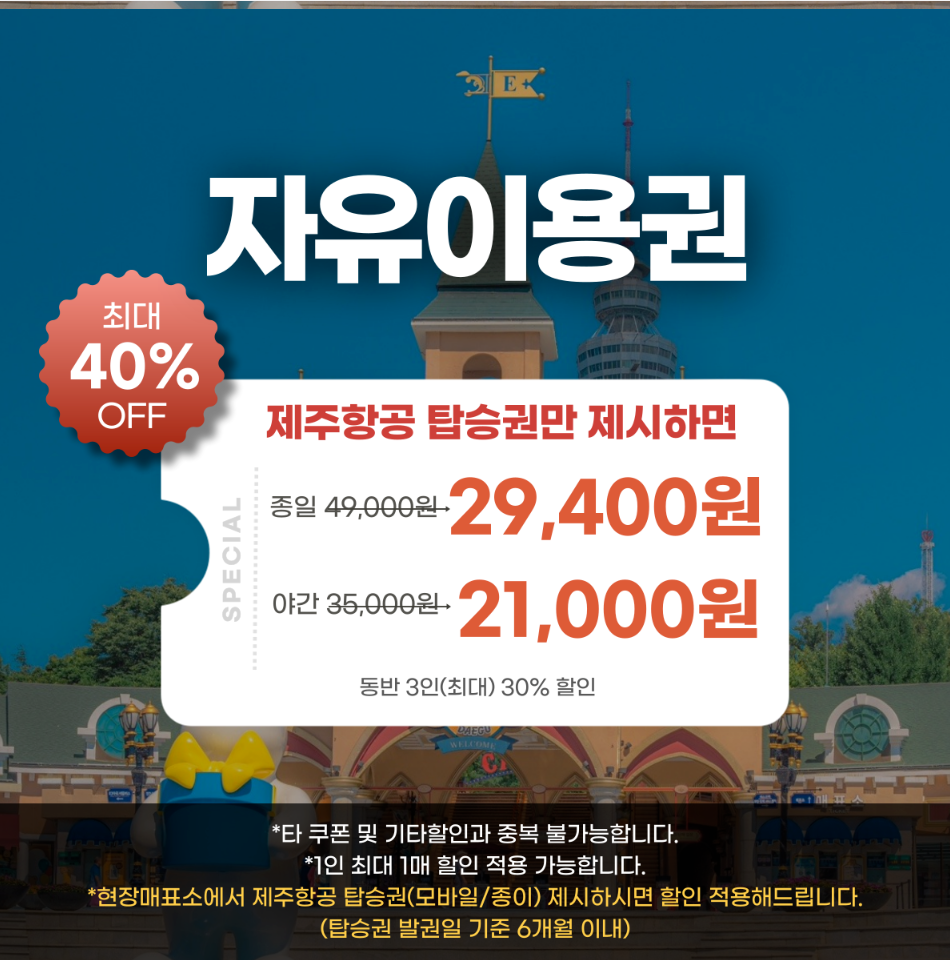 - 자유이용권 구입시 적용 가능한 혜택이며, 종일&야간 자유이용권 모두 할인 적용 가능합니다.