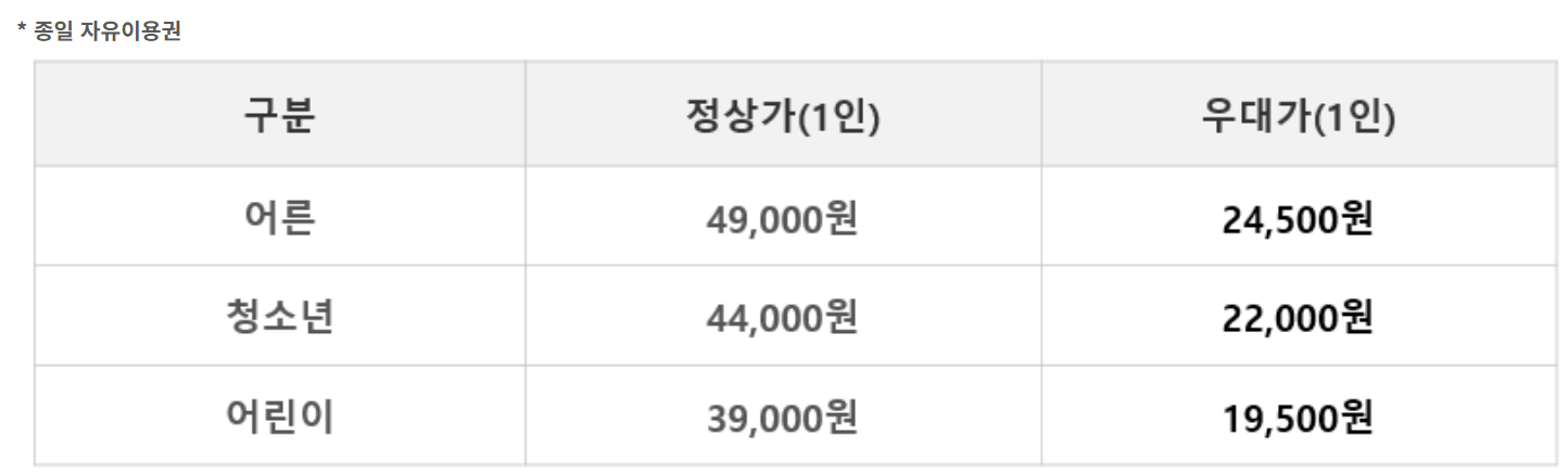 ★ 종일 자유이용권 : 대인 - 49,000원 / 청소년 - 44,000원 / 어린이 - 39,000원 / 36개월 미만 무료