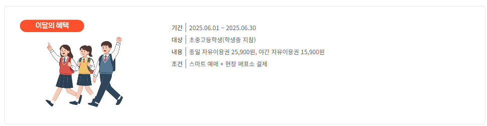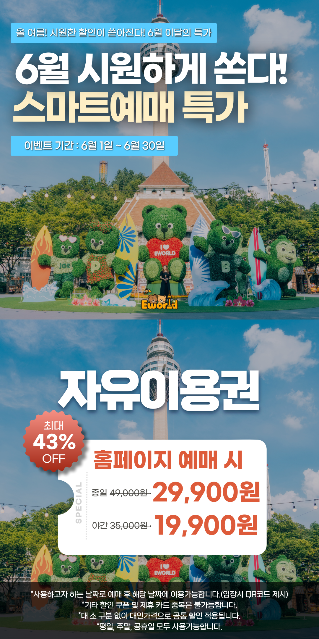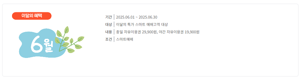특히, 6월달은 스마트 예매 시 최대 43% 할인 된 금액으로 조건 상관없이 예매 가능합니다.