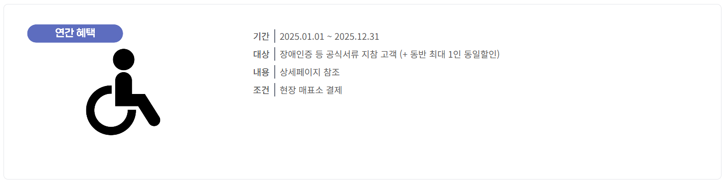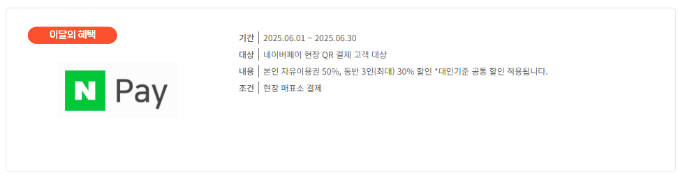 - 현장매표소에서 네이버페이 QR로 예매 시, 할인적용 가능합니다.