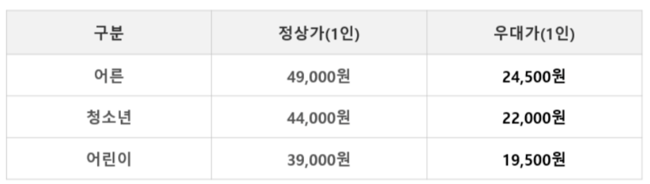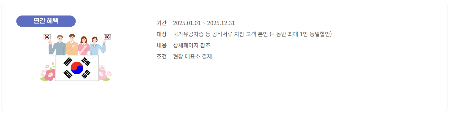 - 할인은 대/중/소 구분없이 일괄 성인가 기준으로 적용되며 동반 최대 1인까지 할인됩니다.