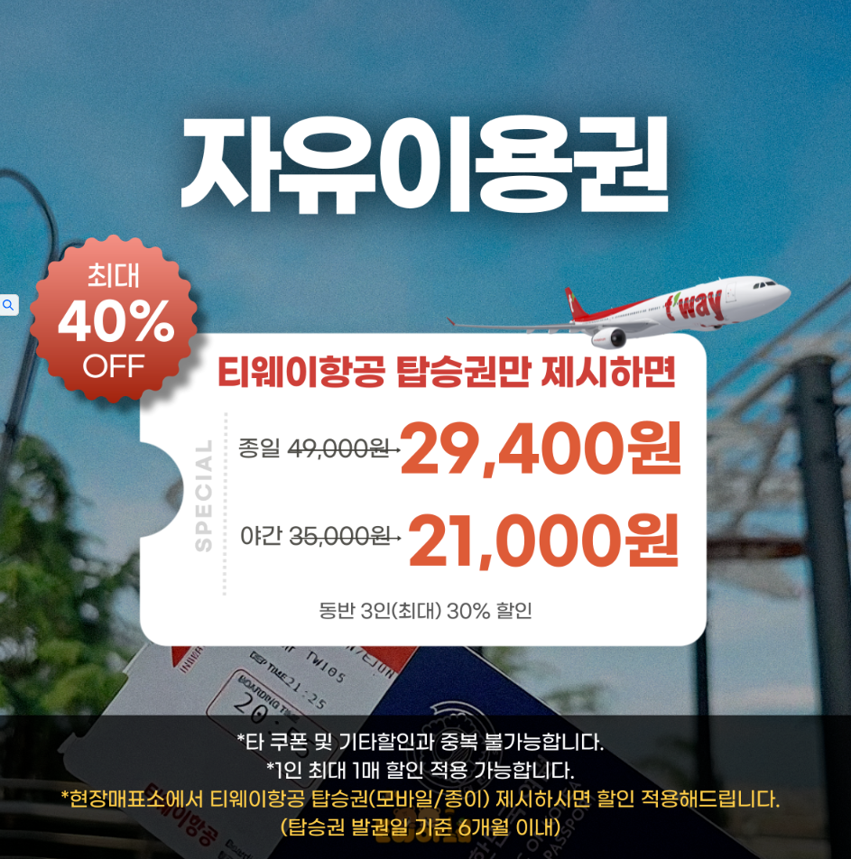 - 현장 매표소에서 티켓 구매 가능합니다. (티웨이, 제주항공 탑승권 제시)