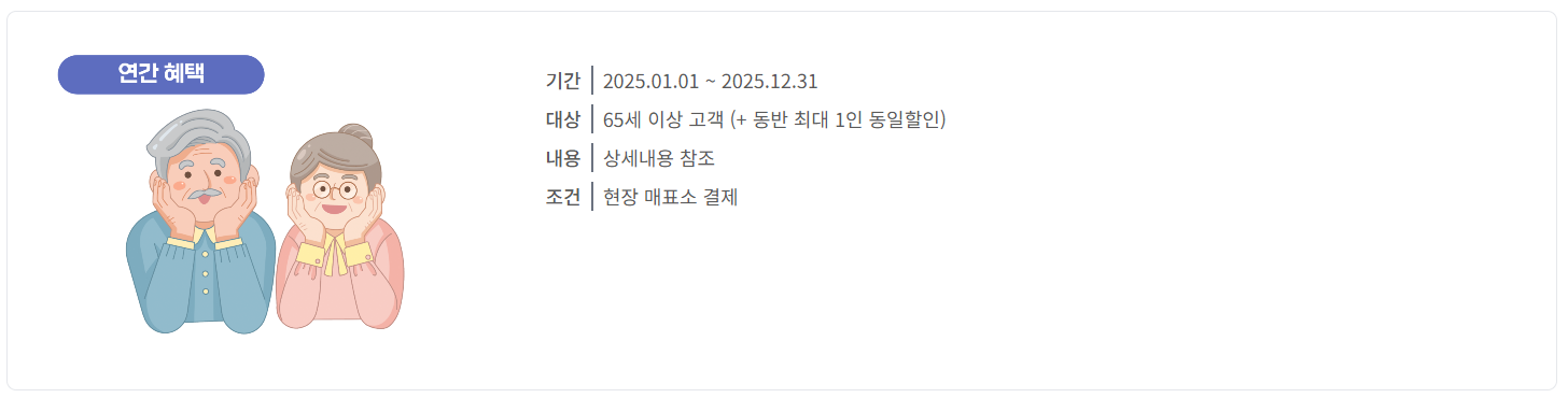 - 경로우대증, 신분증 등 증명자료 제시 시에만 우대 가능합니다.