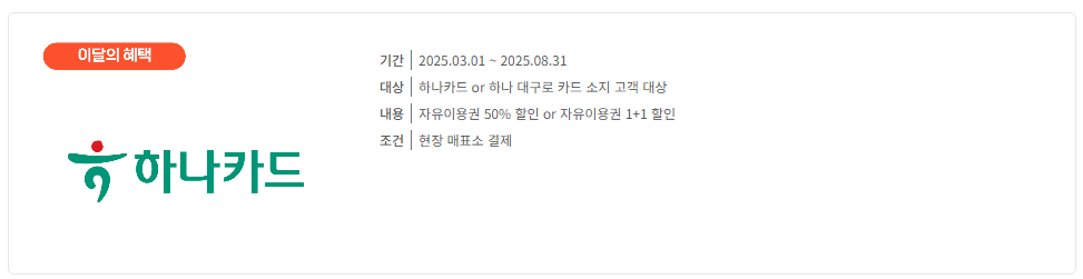 ⑪ 하나카드 특별 50% 할인(실적 제한없음) (25.3.1~25.8.31)